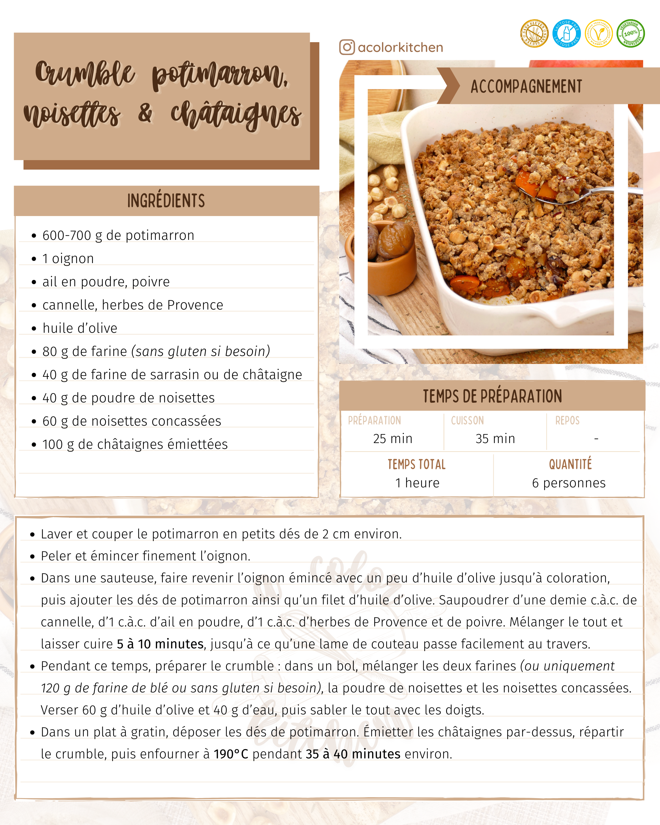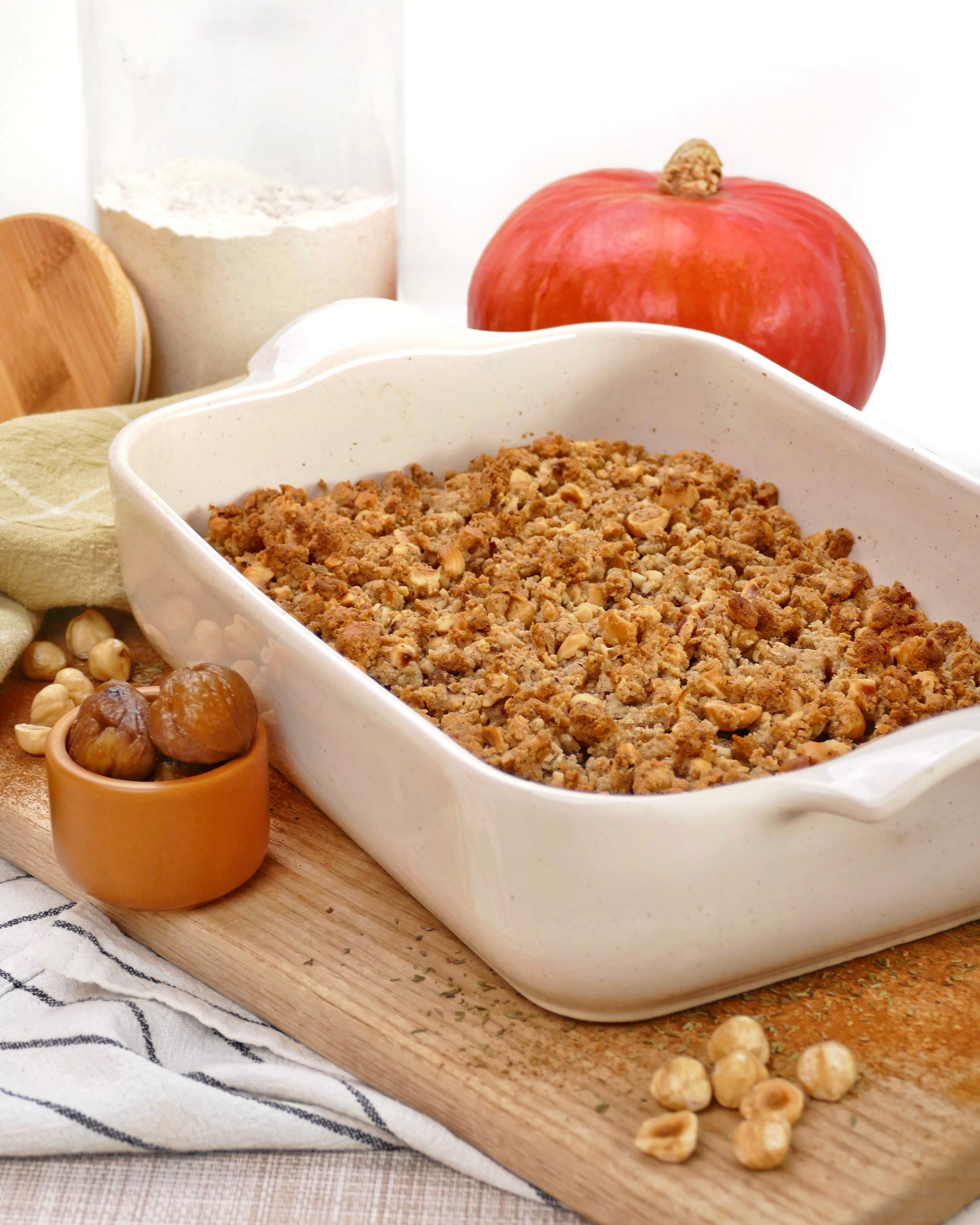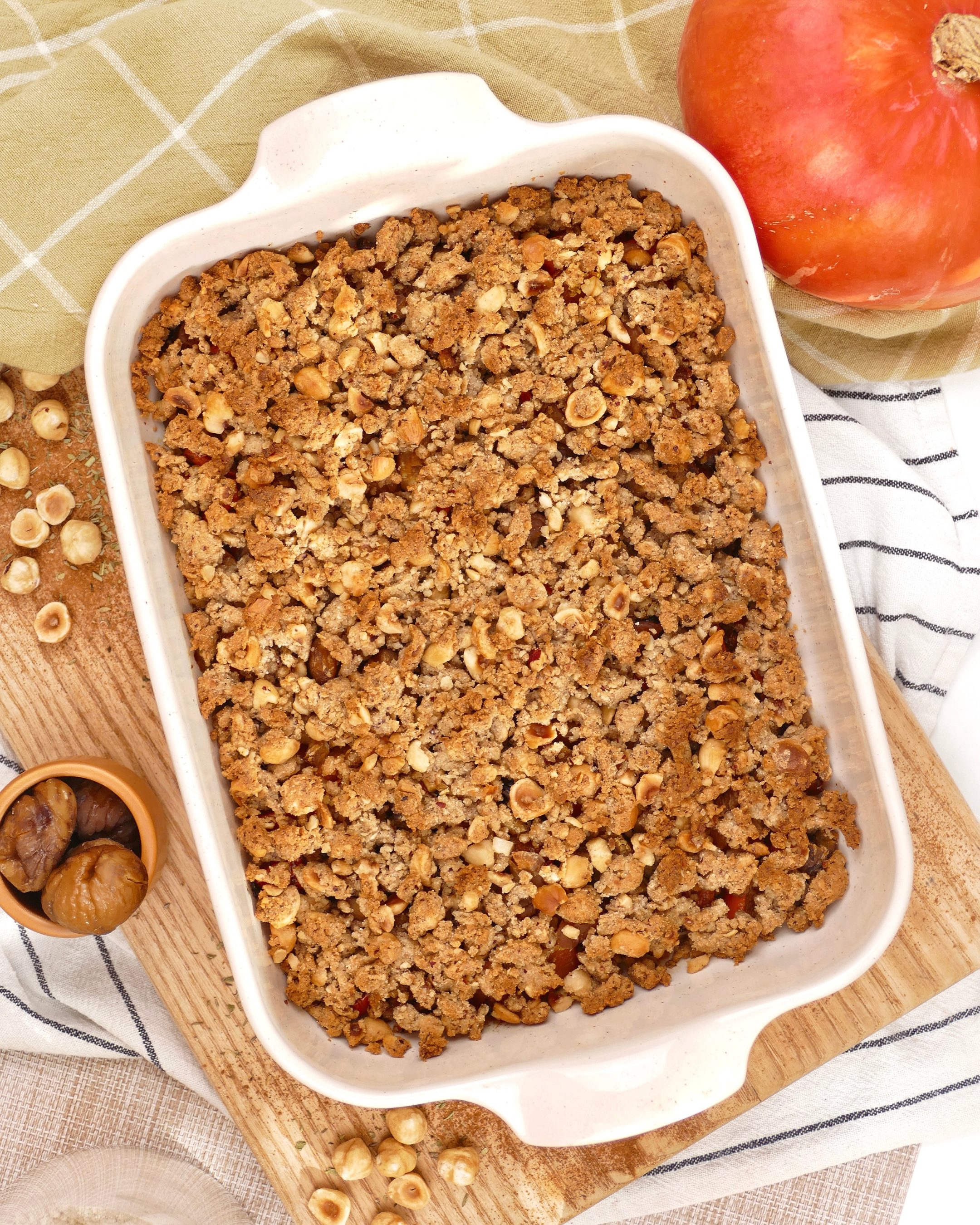 Ce savoureux crumble de potimarron, noisettes et châtaignes marie la douceur du potimarron, le goût boisé des châtaignes et le croquant des noisettes. Le tout est relevé par un mélange d’épices et surplombé d’un crumble rustique à la farine de châtaigne et aux noisettes.