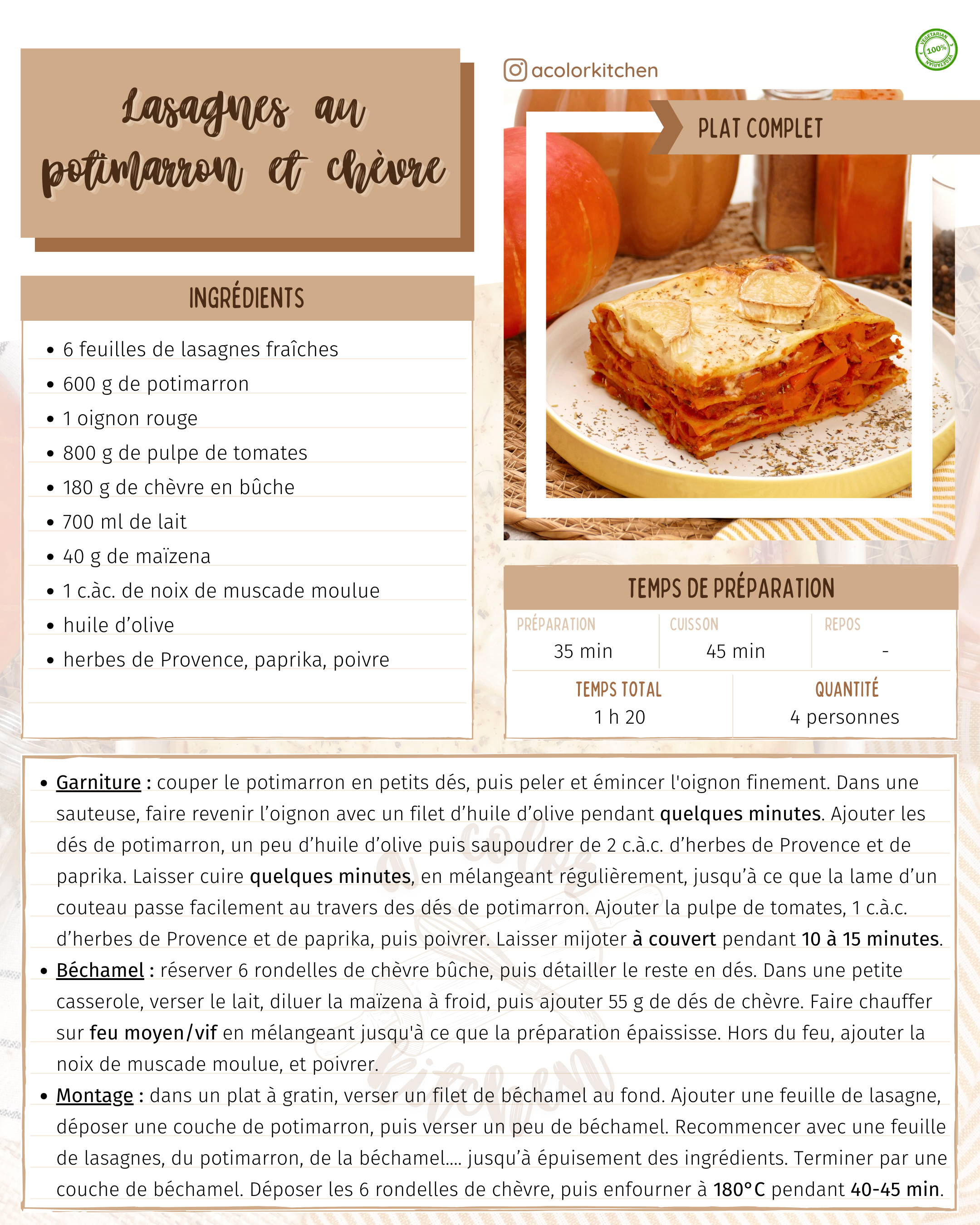 Ces lasagnes au potimarron et au chèvre allient la douceur des courges de saison, parfumées aux herbes de Provence et au paprika, associées au fondant du chèvre et aux oignons rouges caramélisés : la promesse d’un repas généreux, convivial et plein de caractère.