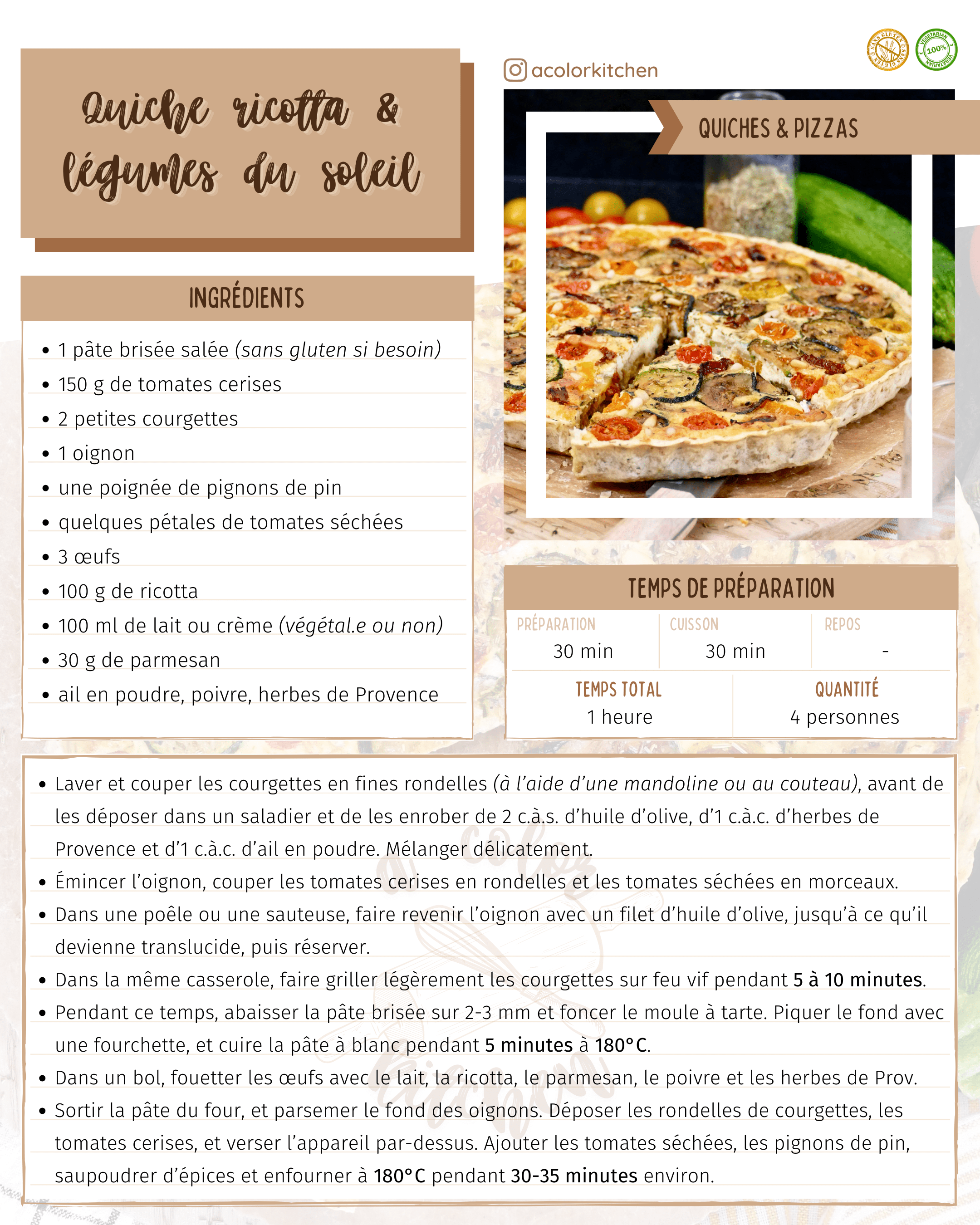 - Adaptez la quantité des ingrédients à la taille de votre moule ! Ne mettez pas toutes les courgettes ou le flan à la ricotta si le moule est déjà rempli, ou bien profitez-en pour réaliser des mini tartelettes à côté, avec les chutes de pâte brisée.