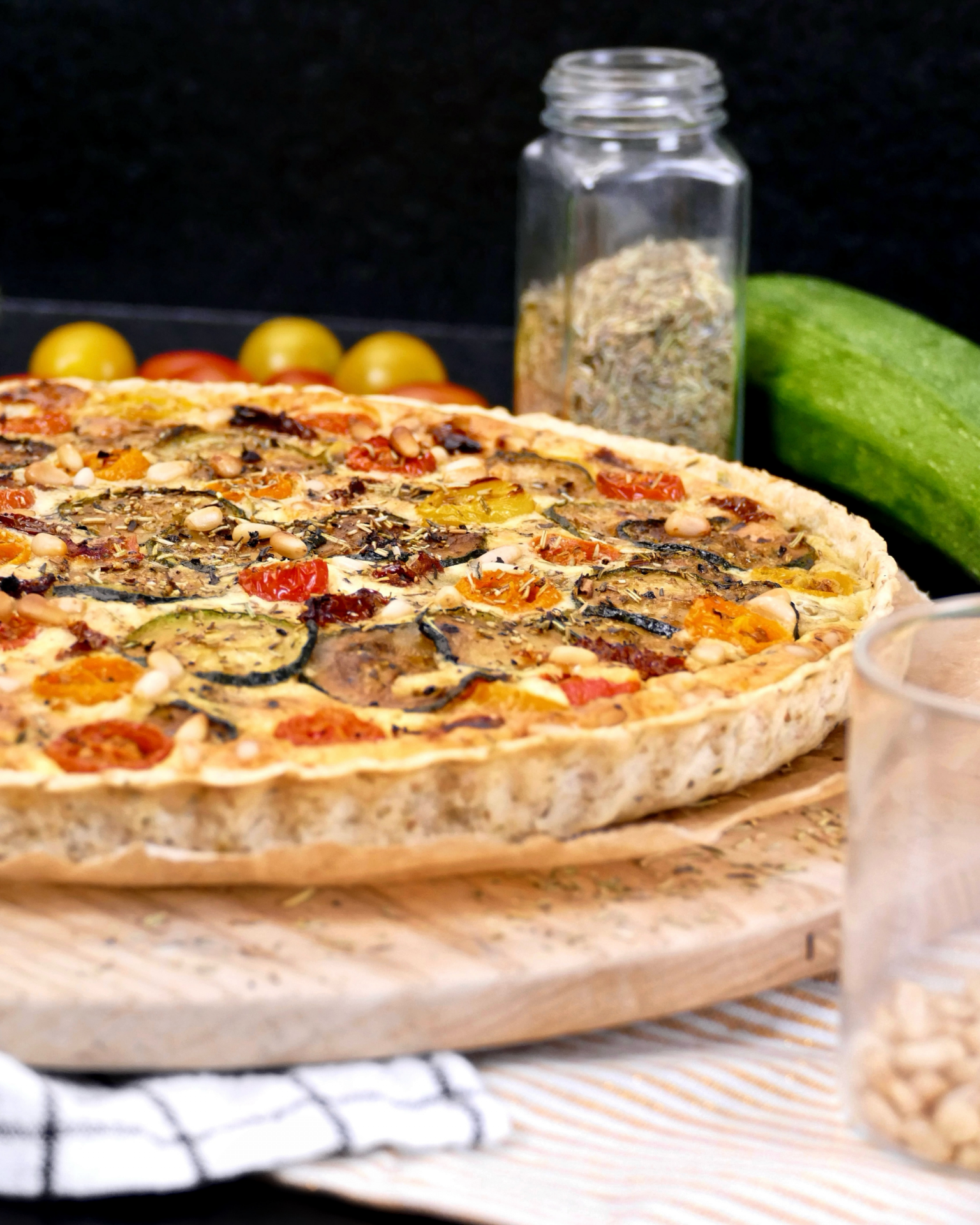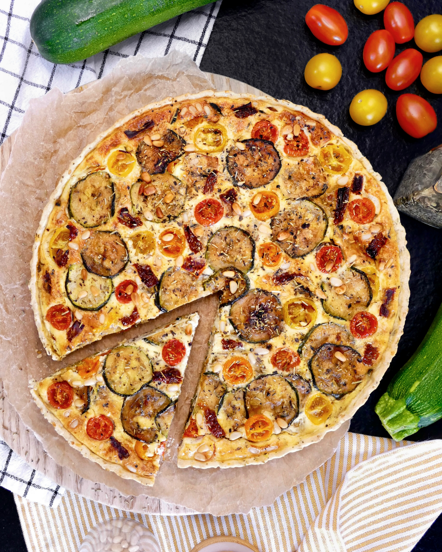 Tomates cerises, courgettes, oignons et pignons de pin se fondent dans une délicieuse préparation à la ricotta et parmesan, sublimée par les herbes de Provence 🌿